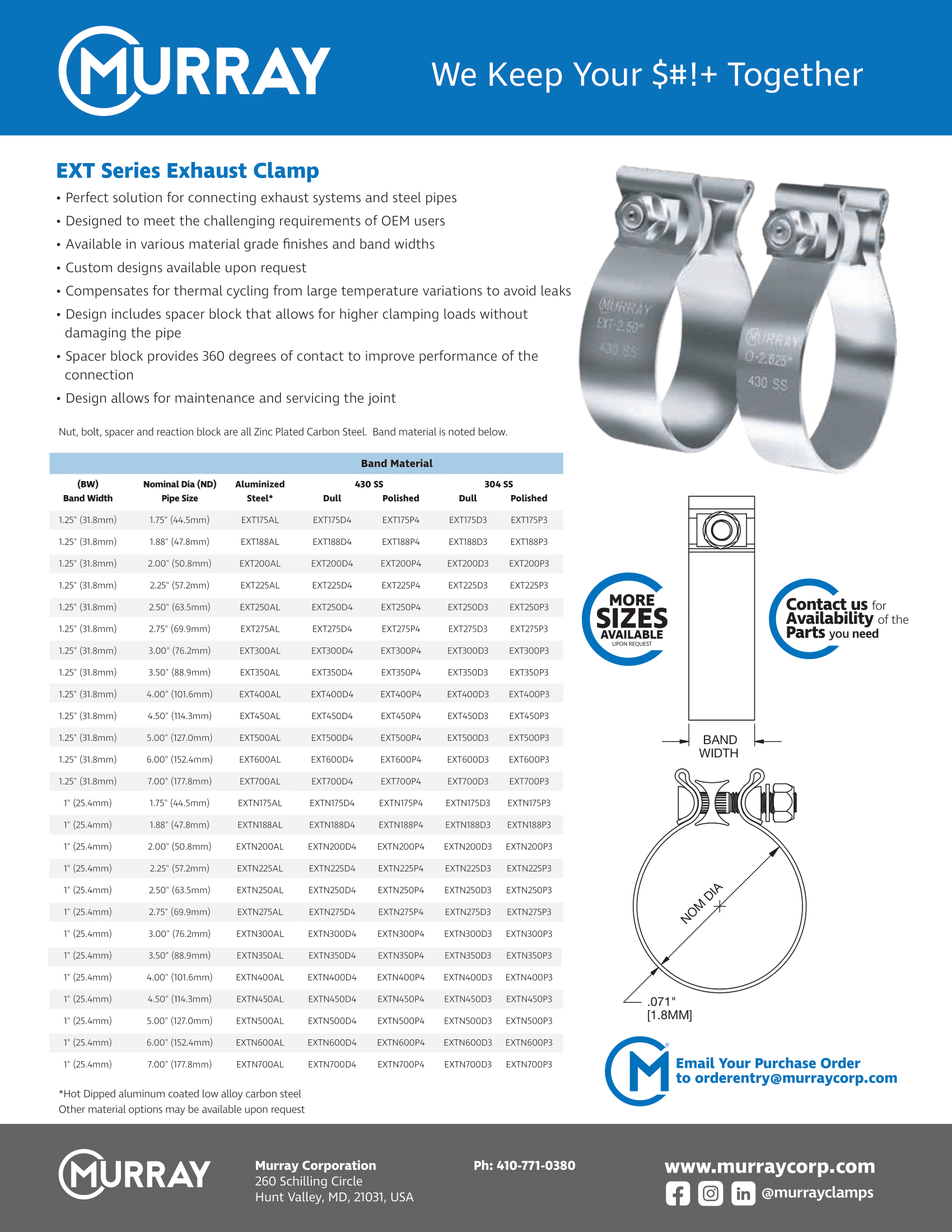 EXT Series exhaustclamps are designed to ensure leak free connections of exhaust pipes and similar metal pipes and are a suitable alternative to Torca AccuSeal® exhaust clamps. We manufacture our exhaust band clamps with premium quality materials so that mufflers and exhaust systems will perform properly even after temperature changes and thermal cycling can lead to loose connections. We offer the most common sizes and can custom engineer our exhaust band clamps to your specific needs. Sizes offered are designed for pipes ranging from 1.5 inches to 7 inches, with special sizes, shapes and materials available. Our EXT Series clamps are made to meet the high standards and requirements of the OEM market, and are sold to manufacturers, distributors and retailers. We look forward to your projects to provide the right solution to your challenge.